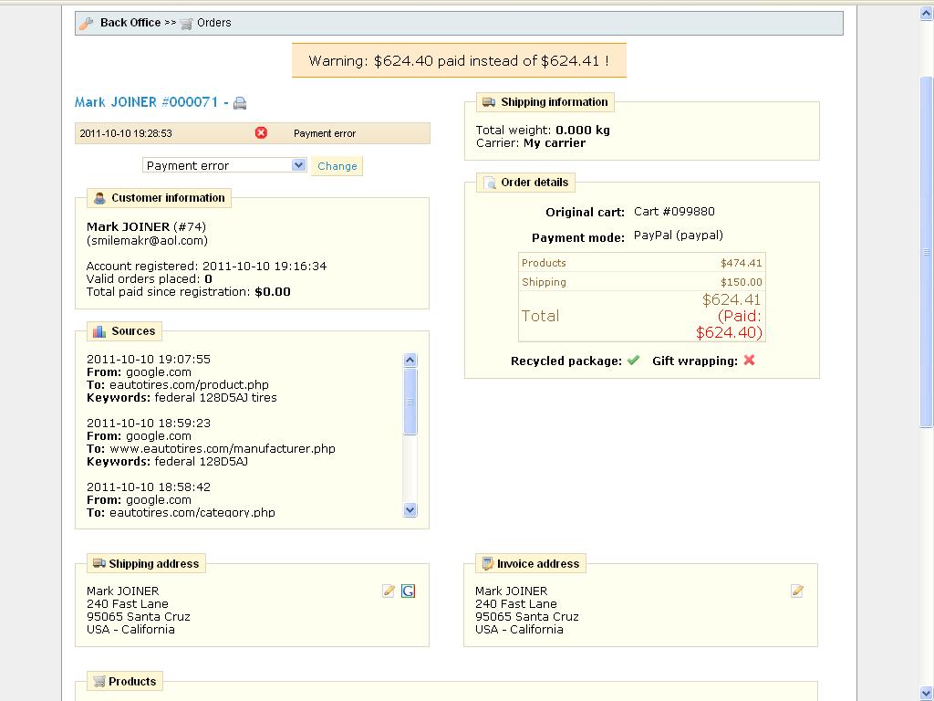 Greeta Posted October 12, 2011 Share Posted October 12, 2011 Our customer has order a product from our prestashop site. We have used Prestashop v1.2 and paypal v1.6. Customer got a payment error and Back Office->order list says, Warning: $624.40 paid instead of $624.41 !. [Please check attachments.] Why this happen? Does our customer has $0.01 less amount or have to upgrade new version to solve this or else how to stop payment if this error occurs. How to fix this? Its very urgent. Please reply. Thanks. Link to comment Share on other sites More sharing options...