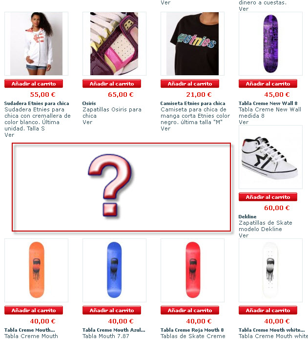 www.madridwebdesign.es Posted October 17, 2011 Share Posted October 17, 2011 Hola en la web www.ropaskate.es aparecen los productos sin estar centrados, se muestran en varias filas pero no están correctamente repartidas. El caso es que ocurre en dos presta diferentes. Adjunto imagen por si hay alguien a quien se le ocurra por que puede ser. La zona de la interrogacion es donde no me aparece nada.. La interrogacion y el cuadro lo he puesto yo.. no vaya a ser que confunda.. El caso es que he cambiado cuantos se deben de mostrar y no llega a mostrarse correctamente. Gracias a todos! Saludos Link to comment Share on other sites More sharing options...