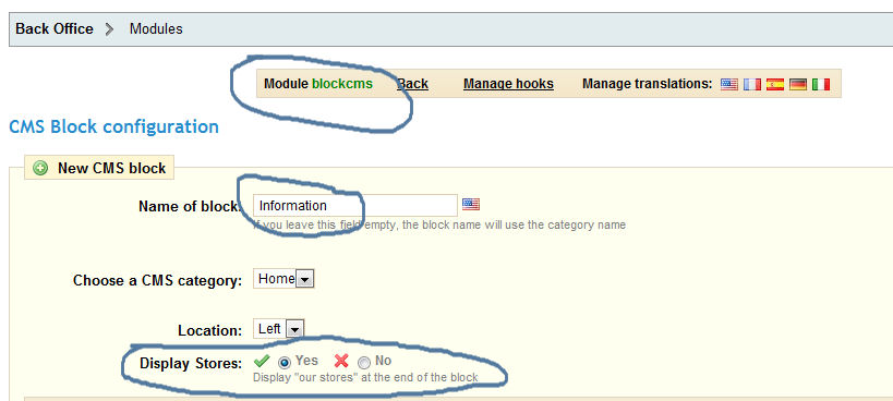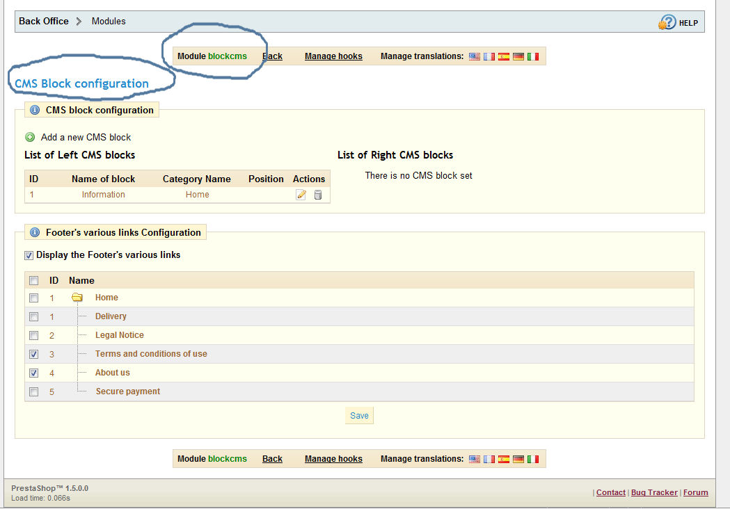 guest* Posted October 22, 2011 Share Posted October 22, 2011 Du bist ganz falsch. Ich habe nicht geschrieben unter Tools -> CMS-Seiten, sondern Module -> dort die Suche nutzen und CMS-Block suchen. Diesen konfigurieren. Dann hast du dort einen CMS-Block mit den Namen Informationen - diesen Bearbeiten. Es müsste auch noch ein zweiter Block angelegt worden sein mit FAQ, soweit ich das im ersten Bild sehen kann. Hier auch den Shops Link rausnehmen. Bei mir Englisch, weil ich die Entwicklerversion fahre. Link to comment Share on other sites More sharing options...