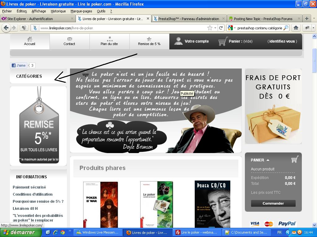 Foster Posted October 29, 2011 Author Share Posted October 29, 2011 Oui oui je l'ai bien fait, voici mon header mais à priori je ne vois rien d'anormal : <!DOCTYPE html PUBLIC "-//W3C//DTD XHTML 1.1//EN" "http://www.w3.org/TR/xhtml11/DTD/xhtml11.dtd"> <html xmlns="http://www.w3.org/1999/xhtml" xml:lang="{$lang_iso}"> <head> <title>{$meta_title|escape:'htmlall':'UTF-8'}</title><script type="text/javascript" src="https://apis.google.com/js/plusone.js"></script><script src="http://connect.facebook.net/fr_FR/all.js#xfbml=1"></script> {if isset($meta_description) AND $meta_description} <meta name="description" content="{$meta_description|escape:html:'UTF-8'}" /> {/if} {if isset($meta_keywords) AND $meta_keywords}<g:plusone></g:plusone> <meta name="keywords" content="{$meta_keywords|escape:html:'UTF-8'}" /> {/if} <meta http-equiv="Content-Type" content="application/xhtml+xml; charset=utf-8" /> <meta name="generator" content="PrestaShop" /> <meta name="robots" content="{if isset($nobots)}no{/if}index,follow" /> <link rel="icon" type="image/vnd.microsoft.icon" href="{$img_ps_dir}favicon.ico?{$time}" /> <link rel="shortcut icon" type="image/x-icon" href="{$img_ps_dir}favicon.ico?{$time}" /> <script type="text/javascript"> var baseDir = '{$content_dir}'; var static_token = '{$static_token}'; var token = '{$token}'; var priceDisplayPrecision = {$priceDisplayPrecision*$currency->decimals}; var priceDisplayMethod = {$priceDisplay}; var roundMode = {$roundMode}; </script> {if isset($css_files)} {foreach from=$css_files key=css_uri item=media} <link href="{$css_uri}" rel="stylesheet" type="text/css" media="{$media}" /> {/foreach} {/if} {if isset($js_files)} {foreach from=$js_files item=js_uri} <script type="text/javascript" src="{$js_uri}"> {/foreach} {/if} {$HOOK_HEADER} </head> <body {if $page_name}id="{$page_name|escape:'htmlall':'UTF-8'}"{/if}> <!--[if lt IE 7]><div style='clear:both;height:59px;padding:0 15px 0 15px;position:relative;z-index:10000;text-align:center;'><a href="http://www.microsoft.com/windows/internet-explorer/default.aspx?ocid=ie6_countdown_bannercode"><img src="http://www.theie6countdown.com/images/upgrade.jpg" border="0" height="42" width="820" alt="You are using an outdated browser. For a faster, safer browsing experience, upgrade for free today." /></a></div><![endif]--> {if isset($ad) && isset($live_edit)}{include file="$tpl_dir./live_edit.tpl"}{/if} {if !$content_only} {if isset($restricted_country_mode) && $restricted_country_mode}<div id="restricted-country"><p>{l s='You cannot place a new order from your country.'} <span class="bold">{$geolocation_country}</span></p></div>{/if} <div id="wrapper1"> <div id="wrapper2"> <div id="wrapper3"> <!-- Header --> <div id="header"> <a id="header_logo" href="{$base_dir}" title="{$shop_name|escape:'htmlall':'UTF-8'}"> <img class="logo" src="{$img_ps_dir}logo.png?{$time}" alt="{$shop_name|escape:'htmlall':'UTF-8'}" /> </a> <span class="logo2"><img src="{$img_dir}logo2.png?{$time}" alt="{$shop_name|escape:'htmlall':'UTF-8'}" /></span> <div id="header_right"> {$HOOK_TOP} </div> </div><fb:like layout="button_count" font="arial"></fb:like> <div id="columns"></div> <!-- Left --> <div id="left_column" class="column">{$HOOK_LEFT_COLUMN}</div> <!-- Center --> <div id="center_column" class="center_column"> <div id="center_column_inner"> {/if} Link to comment Share on other sites More sharing options...