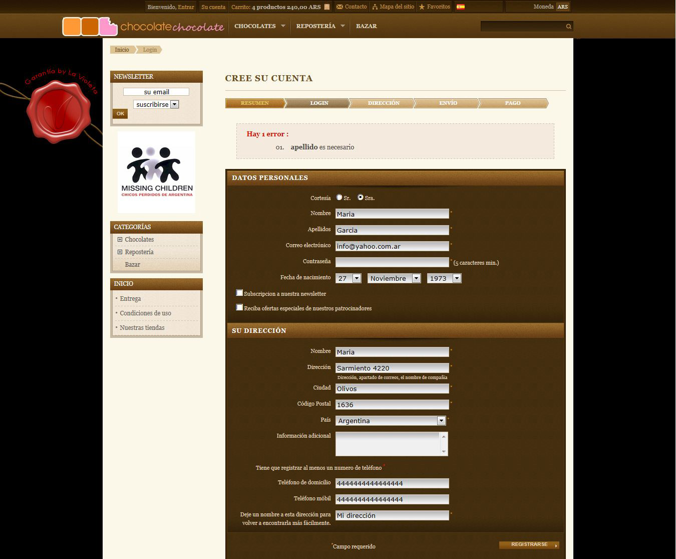 Creo que el error es que no aparece el casillero de Apellido, en los datos de "Su dirección".-