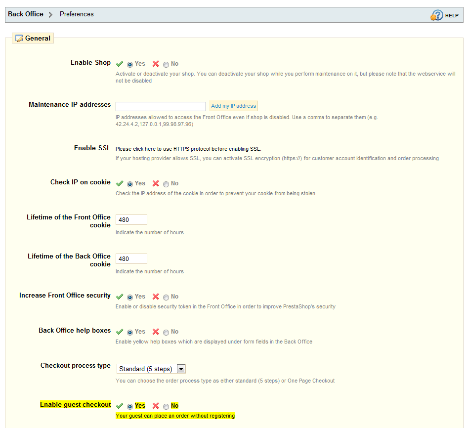 Mike Kranzler Posted November 11, 2011 Share Posted November 11, 2011 I am trying to have the option of Guest Checkout in Prestashop. Is there a setting somewhere built into the default Prestashop that allows this? I've looked around but haven't been able to fine one. If I need to use a module, is there any that work well for what I want to do? There sure is! You can enable it in your Back Office under Preferences. I hope this helps. -Mike Link to comment Share on other sites More sharing options...