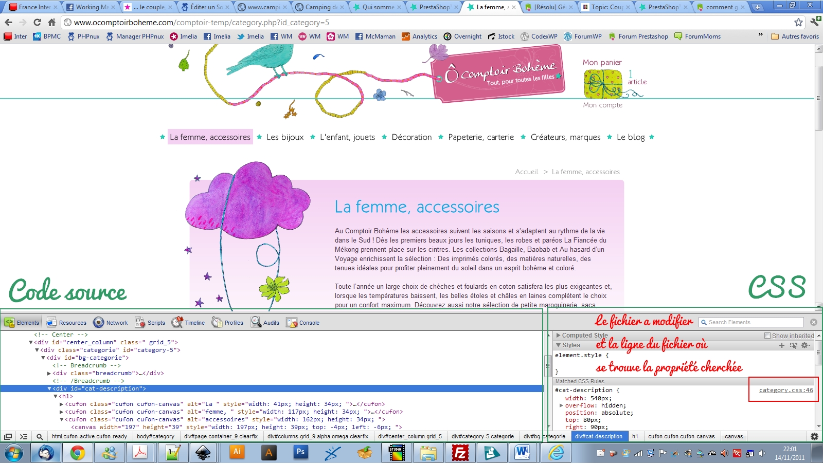 Imelia Posted November 14, 2011 Share Posted November 14, 2011 Quand tu utilises Firebug, tu as deux colonnes: à gauche, le code source, à droite le css associé. Sur chaque section de la colonne CSS, tu as le nom du fichier qui est mentionné. Si tu ne sais pas où le trouver dans l'ensemble des dossiers Prestashop, il te suffit normalement de passer ta souris sur le nom du fichier, et une info bulle avec le chemin complet du fichier devrait apparaître. Je n'utilise plus Firebug car je suis passée à Chrome depuis un moment et il embarque le même système en natif, mais le fonctionnement est identique. Je te mets une capture d'écran pour situer les zones dont je te parle. Dans mon exemple, je modifie une catégorie donc quand j'ouvre mes outils, on me dit qu'il faut que je regarde dans le fichier category.css et que ce que je cherche se trouve à la ligne 46. Au survol de "category.css", on m'indique le chemin complet pour trouver le fichier. Voilà, bon courage Link to comment Share on other sites More sharing options...