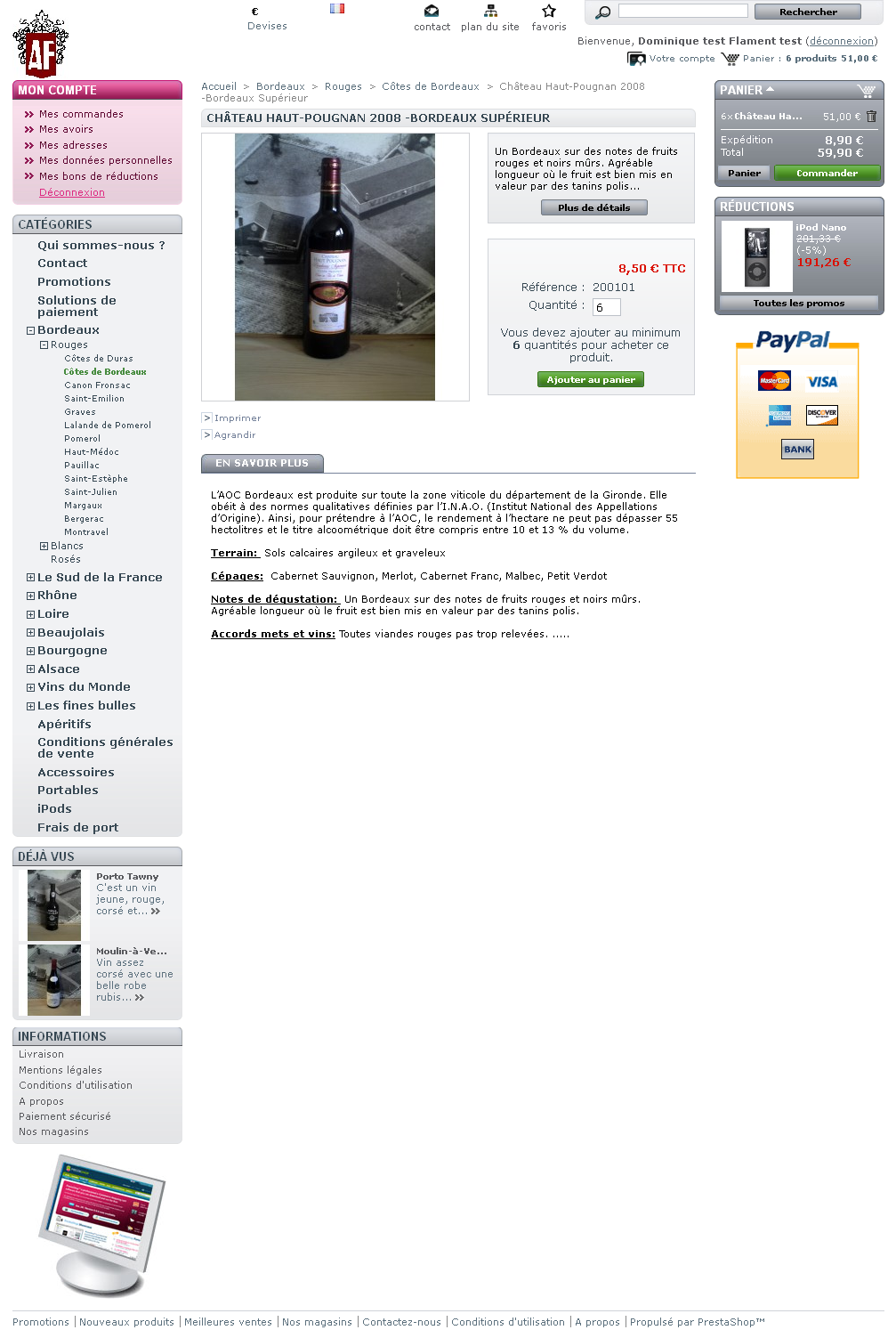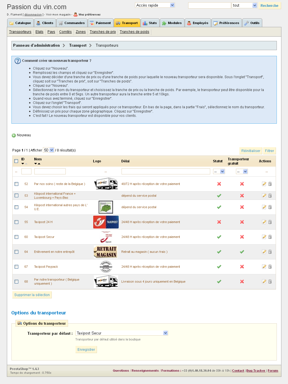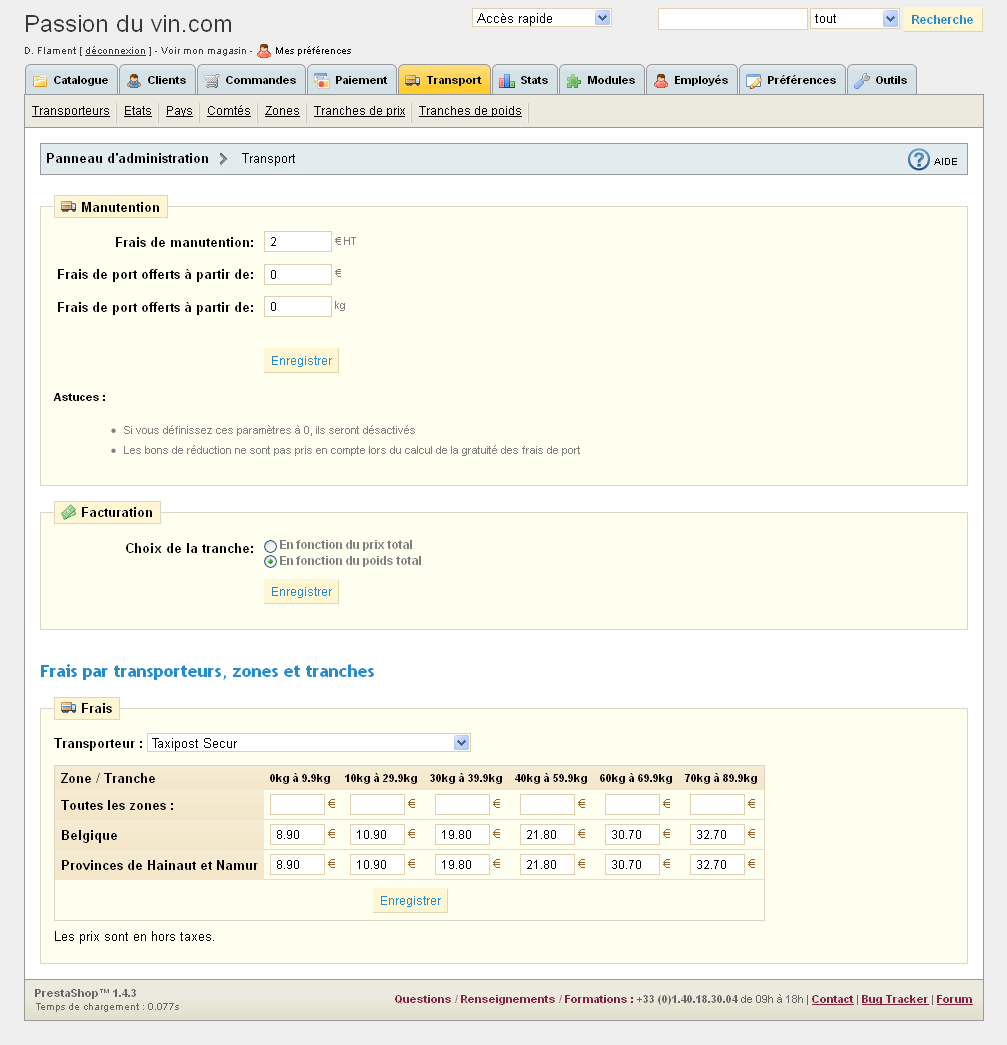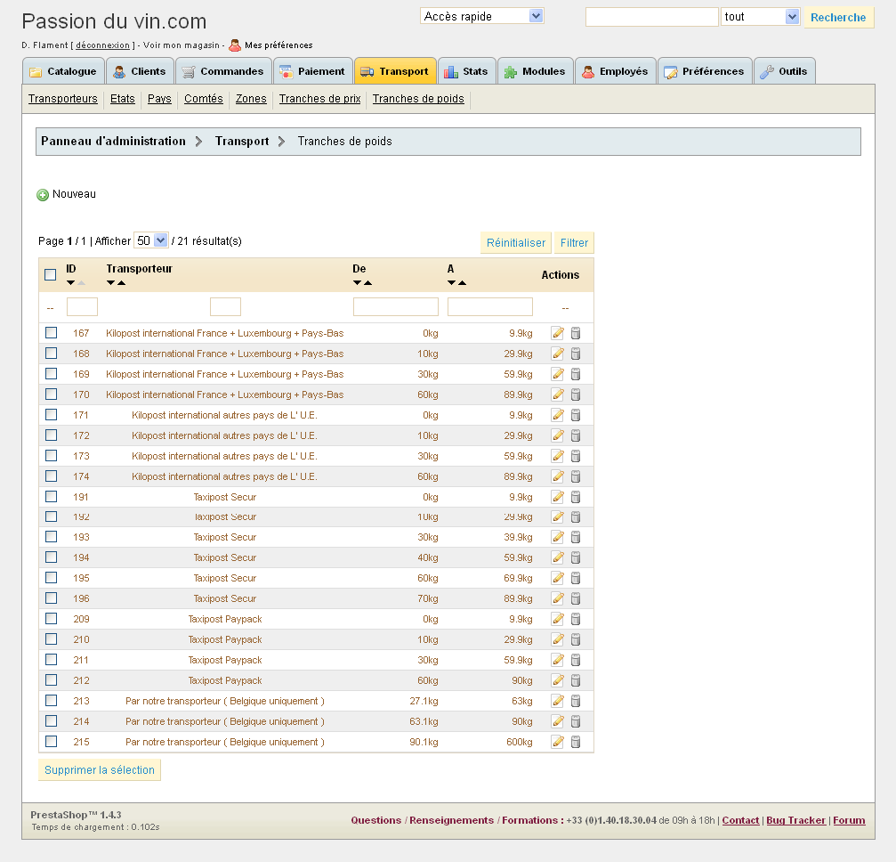 domi0412 Posted November 14, 2011 Share Posted November 14, 2011 Bonjour à vous toutes et tous, J'ai un problème que je n'arrive pas à surmonter depuis plus de 10 jours, j'ai beau chercher sur le forum et internet en général, je ne trouve pas la solution , je pense même devoir abandonner mon travail. Voici mon énorme soucis: je voudrais que lorsque l'un de mes clients commande ( mes frais de port sont calculés par tranches de poids mais ne veulent pas s'appliquer ) . la commande minimum est de 6 bouteilles mais si la personne commande 7 ou 8, voire 12 bouteilles, je voudrais pouvoir majorer les frais de port de 1,5 kgs par bouteille ajoutée ( exemple : commande de 6 bouteilles = 8,90 € de port selon pays ) et si x bouteilles supplémentaires, pouvoir soit passer dans une tranche supérieure ou ajouter un poids par bouteille supplémentaire. Je comprends plus rien, merci de bien vouloir m'aider ci-joint quelques photos afin que vous puissiez comprendre mon problème sur mon site http://www.passion-du-vin.com Link to comment Share on other sites More sharing options...