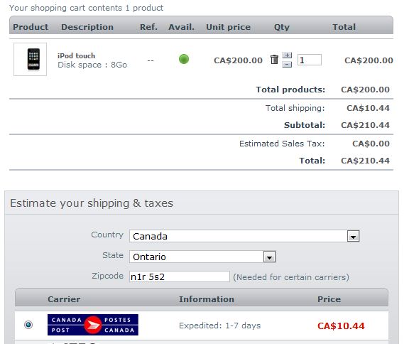 dragon123 Posted November 15, 2011 Author Share Posted November 15, 2011 Not a clean solution but don't want to waste more time on that stuff: in your template shopping-cart.tpl <tr class="cart_total_tax"> <td colspan="6"> <!-- ESTIMATION OF TAX RATE --> {if $id_state == 89||$id_state == 90||$id_state == 96||$id_state == 98||$id_state == 95||$id_state == 87||$id_state == 91||$id_state == 97} {$Taxrate=.05} {$Taxname="GST"} {else if $id_state == 88} {$Taxrate=.12} {$Taxname="HST"} {else if $id_state == 92} {$Taxrate=.15} {$Taxname="HST"} {else if $id_state == 93||$id_state == 313||$id_state == 94||$id_state == 86} {$Taxrate=.13} {$Taxname="HST"} {else} {$Taxrate=0} {$Taxname=""} {/if} {if $display_tax_label} {l s='Total tax:'} {else} {$Taxname} {l s='Estimated Sales Tax:'} {/if} </td> <td class="price" id="total_tax">{displayPrice price=($total_price*$Taxrate)}</td> <!-- <td class="price" id="total_tax">{displayPrice price=$total_tax}</td> --> </tr> Technically I would like a simple SQL statement like the one below but I do not know how to call the function in the shopping-cart.tpl page public static function getTaxRatedByState($id_state, $active =1) { $tax = Db::getInstance(_PS_USE_SQL_SLAVE_)->getRow(' SELECT t.`rate` FROM `'._DB_PREFIX_.'tax` t JOIN `'._DB_PREFIX_.'tax_rule` tr ON (tr.id_tax = t.id_tax) WHERE tr.`id_state` = '(int)($id_state). ($active == 1 ? ' AND t.`active` = 1' : '')); return $rate ? (int)($tax['rate']) : false; } Just throwing it out there, no one seems to answer much on the forum anyway. Link to comment Share on other sites More sharing options...