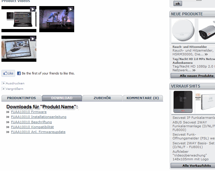 bmt8630 Posted November 17, 2011 Author Share Posted November 17, 2011 Hallo cd2500 Vielen Dank für die Antwort aber ich möchte nich den Text übersetzen sonder ein Feld (wahrscheinlich Produktname) welches in der Detailansicht oben ja bereits kommt zusätzlich unter Downloads, Zubehör und Komentare einfügen. Das Resultat wäre dann wie auf dem Beispielbild: Downloads für Abus Secvest 2Way Funkalarmanlage: Ich weiss aber nicht wie und wo ich das machen könnte. Link to comment Share on other sites More sharing options...