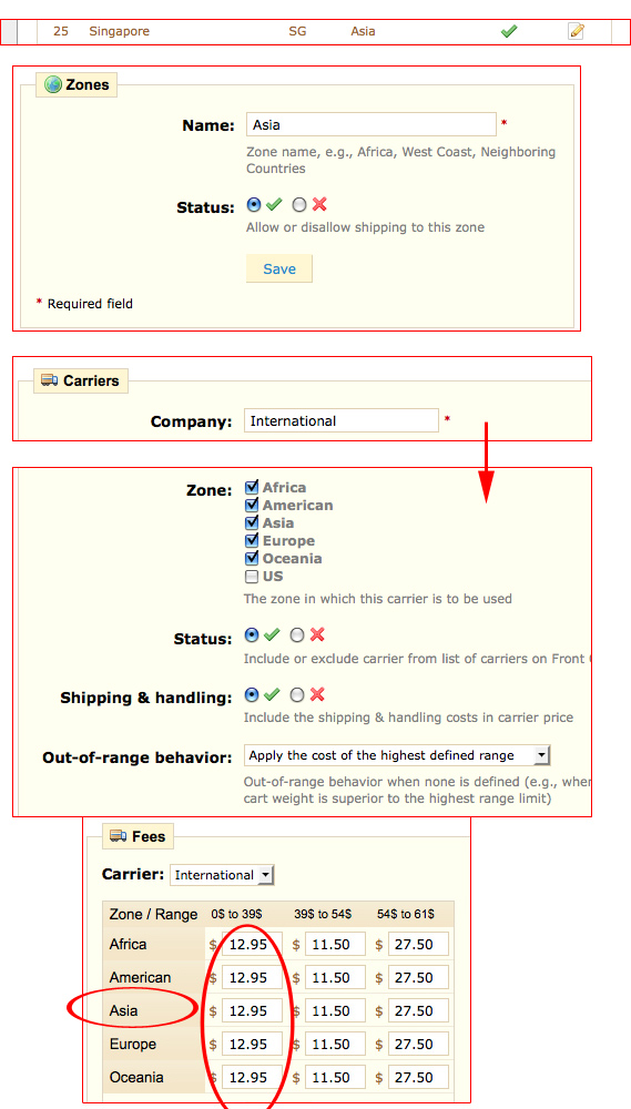 suva Posted November 17, 2011 Share Posted November 17, 2011 Hi We have a shop that has been up and running for a while with no major issues (Version 1.2.5.0) We just added new products that require a different "International" shipping cost then the rest. For Example: T-Shirt cost $35 - Shipping $12.95 Poster Print $60 - Shipping $27.50 Here is what we did: 1) In Shipping we created "International" carrier 2) In Price Rages we created 3 different price ranges: $0-$39 / $39-$54 / $54-$61 3) In Billing we checked "According to total price" 4) In Fees we selected "International" carrier and added shipping cost for the 3 price ranges BUT when we go to the shop and add our T-shirt of $35 the International shipping comes up as $27.50 and NOT $12.95. And that goes to all products they are all being applied the highest cost (The Out-of-range behavior) The question is why. Since the price ranges are set up in a way that there is no out-of-range behavior Can some one please help. I am attaching screen shots of all these settings. Link to comment Share on other sites More sharing options...
