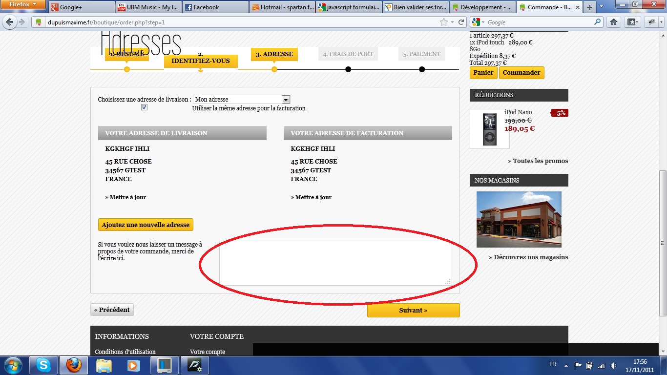 darkhalo Posted November 17, 2011 Share Posted November 17, 2011 Bonjour tout le monde ! Je me permets de poster sur le forum car je rencontre un petit souci : pour une raison X je souhaite rendre le champ, en dessous des adresses de livraison et de facturation, obligatoire. Pour le moment toutes mes tentatives se sont soldées par un échec empêchant la page de s'ouvrir correctement. La page en question est order-address.tpl Et le champ que je souhaite modifier comprend ce code : <div id="ordermsg"> <p><h1>{l s='If you would like to add a comment about your order, please write it below.'}</h1></p> <p class="textarea"><textarea cols="77" rows="3" name="message">{if isset($oldMessage)}{$oldMessage}{/if}</textarea></p> </div> Ma question est donc la suivante : Comment pourrais je rendre ce champ obligatoire à l'aide de javascript ? Merci d'avance pour vos réponses. Cordialement Link to comment Share on other sites More sharing options...
