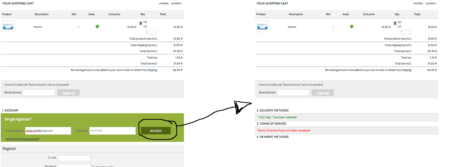 Naturvis Posted November 24, 2011 Share Posted November 24, 2011 Ciao a tutti, vi scrivo perché ho un piccolo grande problema al momento del checkout veloce quando inserisco i dati per il log-in mi scompare il form ma nn ricompare il riepilogo. Col tema originale di prestashop funziona tutto, ma con il tema che uso http://addons.prestashop.com/it/high-tech/1682-electronics-store.html nn riesco ad andare avanti con gli step. vi allego un'immagine per capire meglio. potete aiutarmi? Link to comment Share on other sites More sharing options...