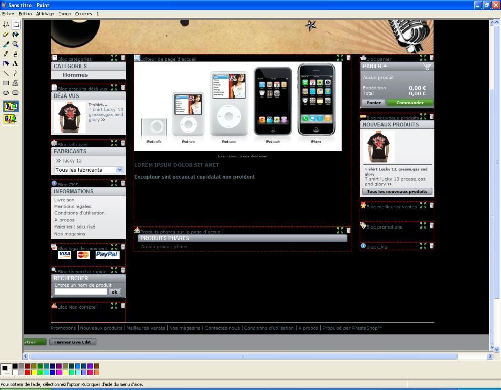 rodstriper Posted November 27, 2011 Share Posted November 27, 2011 salut a tous,nouveau sur le forum, je suis entrain de mettre en place ma premiere boutique prestashop. Novice en création prestashop et pas super doué en informatique,pour l'instant je me débrouile,grace au forum,j'ai réussi a changé la couleur du background et a mettre un bandeau en haut de mon site Mais la j'ai un probleme auquelle je n'ai pas trouvé de réponse, le bloc mon compte ne s'affiche pas sur la page d'accueil de mon site,pourtant le module est installé et quand je vais dans live edit il s'affiche (enfin il est délimité) voici une copie de mon live edit: Je suis sur prestashop 1.4.5.1 avec le theme prestashop de base Merci d'avance Link to comment Share on other sites More sharing options...