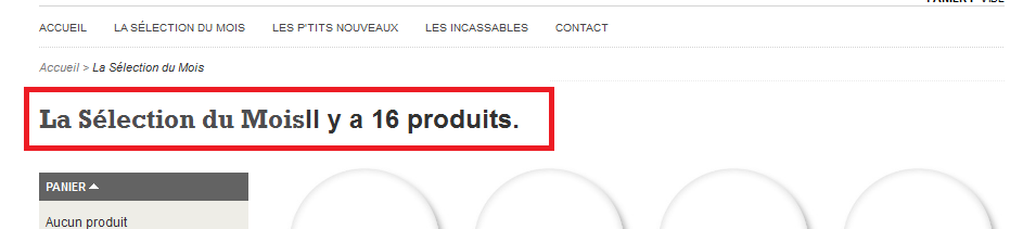 clickforwebdesign Posted November 27, 2011 Share Posted November 27, 2011 Bonsoir a tous, Je souhaiterai supprimer le titre de la page de chaque catégorie en haut de page de présentation des produits. Ci joint la capture d’écran mais je ne sais pas quel fichier tpl il faut supprimer Pouvez vous m'eclairer Merci par avance Link to comment Share on other sites More sharing options...