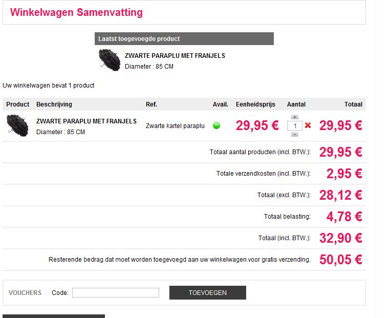 dtgmaze Posted December 2, 2011 Share Posted December 2, 2011 Hoi, ik heb een vraag over de winkelmand , deze is zo onduidelijk. Hoe krijg ik bijvoorbeeld de volgende regels weg bij de eindafrekening. Resterende bedrag dat moet worden toegevoegd aan uw winkelwagen voor gratis verzending 50,05 € Totaal (excl. BTW.):28,12 € Totaal belasting:4,78 € vanaf 80 euro is gratis verzending maar dat hoeft niet in de winkelmand niet vermeld te worden dat maakt de hele winkelmand onduidelijk. groetjes Dennis bezoek ons voor de hipste regenkleding op http://www.loveforrain.nl Link to comment Share on other sites More sharing options...