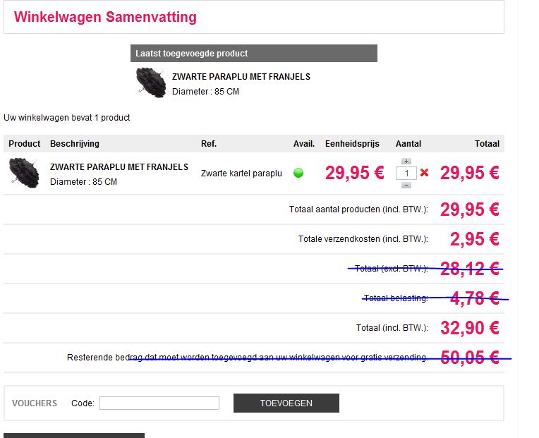 Frens Posted December 2, 2011 Share Posted December 2, 2011 je zult wat moeten gummen in je themes/xxxxx/ shopping-cart.tpl bij <!-- Totaal (ex. Btw): --> <td class="price" id="total_price_without_tax">{displayPrice price=$total_price_without_tax}</td> <!-- Totaal Btw:--> <td class="price" id="total_tax">{displayPrice price=$total_tax}</td> (en de rijen ervoor) <!-- Om in aanmerking te komen voor gratis verzending--> <td id="free_shipping" class="price"></td> de laatste is een optie in je admin en daar dus te regelen ,van de 2 eerste weet ik dat niet verder kijken hoe dit in mail ed geregeld is ! Link to comment Share on other sites More sharing options...