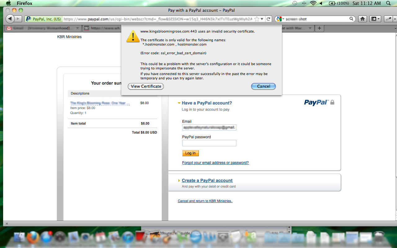 I am attaching a screen shot of a customer who was having another problem once she did get past the initial address problem. What does this mean - invalid security certificate?? Can you duplicate the problem? http://kingsbloomingrose.com/cart2/prestashop/cart?qty=1&id_product=57&add