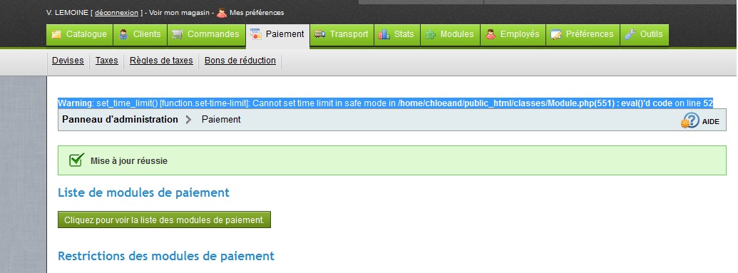 lennynero Posted December 7, 2011 Share Posted December 7, 2011 Bonjour, Je suis en version 1.4.4.0 et je viens de m’apercevoir d'un message d'erreur sur l'onglet paiement une fois que j'ai cliqué dessus. si quelqu’un a une idée je suis preneur. message : Warning: set_time_limit() [function.set-time-limit]: Cannot set time limit in safe mode in /home/chloeand/public_html/classes/Module.php(551) : eval()'d code on line 52 Voilà je joint également une copie écran Merci de votre aide Link to comment Share on other sites More sharing options...