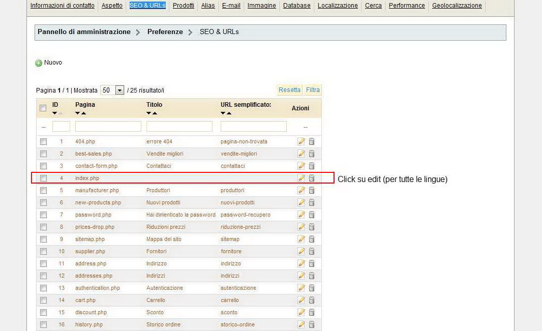 Nsfr750 Posted December 7, 2011 Share Posted December 7, 2011 Si puo' fare tranquillamente dal pannello di amministrazione Preferenze --> SEO & URLs (vedere immagine) Link to comment Share on other sites More sharing options...