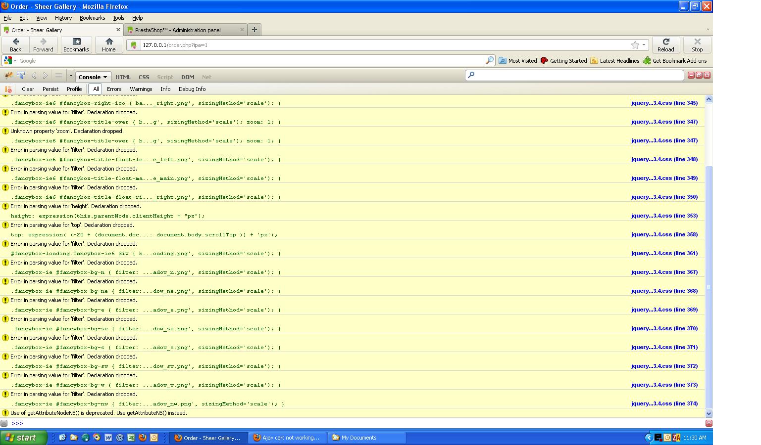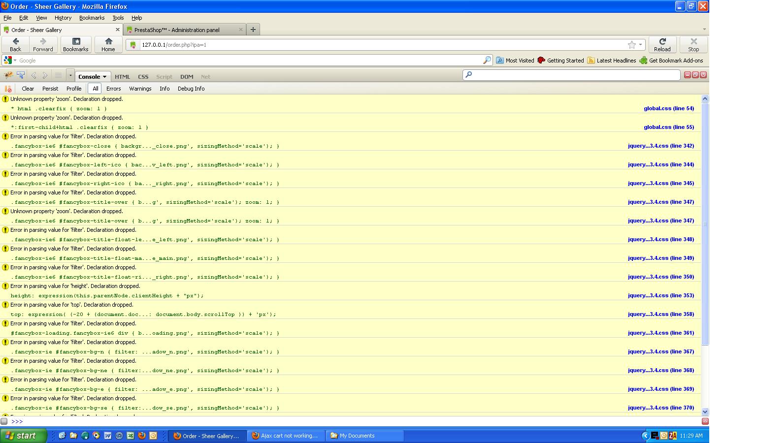 eshops Posted December 17, 2011 Author Share Posted December 17, 2011 Hi Tomerg3, I've disabled and re-emabled the cart module and same for the ajax setting in the cart module, just to ensure all is ok in this area. I've realsied not all erros messages were turned on in Firebug console, so turned on all flags and retried to add a featured product to the cart. Have attached list of errors - most of them appear to be CSS related any thoughts? PS. I've downloaded about 3 previous versions of prestashp in the past and all have worked fine in my easyPHP environment. Its just the latest 1.4.6.2 whereby the ajax doesnt seem to work. regards eshops Link to comment Share on other sites More sharing options...