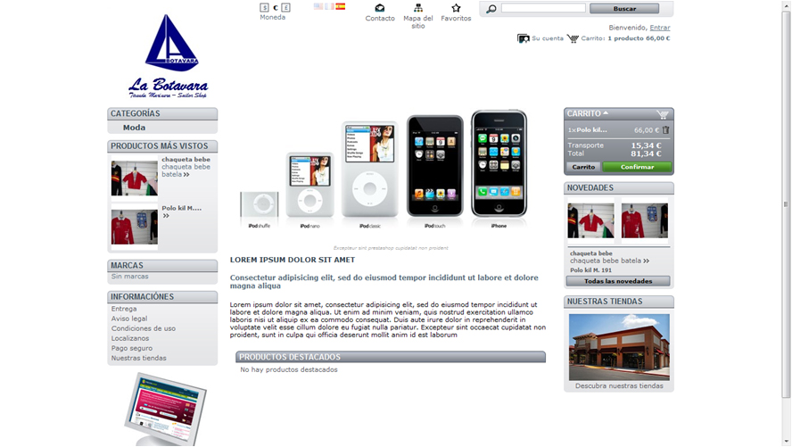 La Botavara Posted December 19, 2011 Author Share Posted December 19, 2011 La forma más fácil de hacer eso es entrar en el BackOffice, en la pestaña Módulos, edita el módulo "Editor de la Página de Inicio", ahí podras editar tanto la imagen de los Ipods como el texto que aparece en esa misma página. Muchísimas gracias, problema solucionado. Link to comment Share on other sites More sharing options...