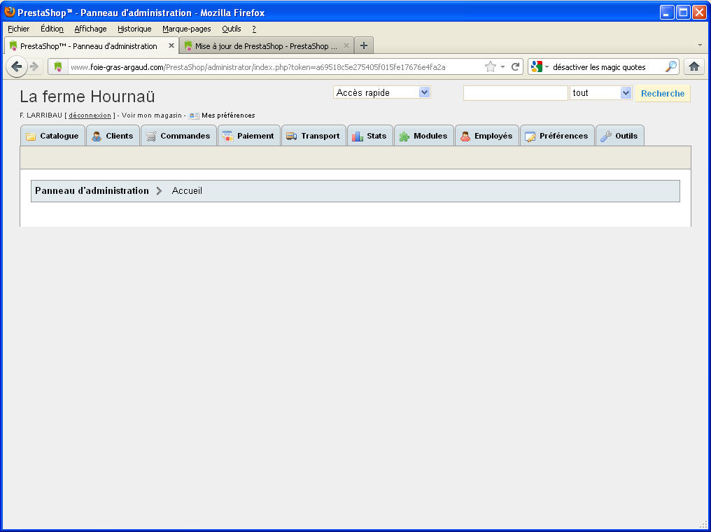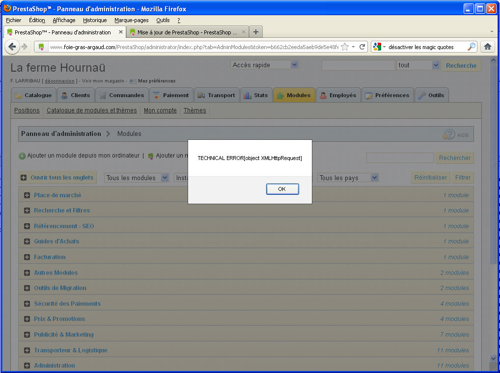 je viens de réussir la mise à jour de ma boutique, au 2ème essai (lors du 1er essai, j'ai cru que le pb venait les Magic Quotes gpc qui sont à 'On' sur mon hébergement OVH).