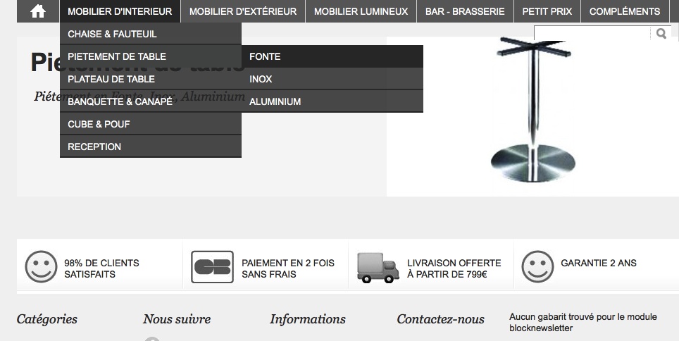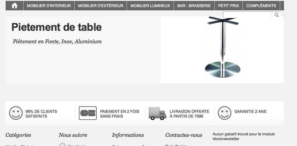 Rapha77 Posted December 29, 2011 Share Posted December 29, 2011 Bonjour, Je suis un peu bloquer j'ai chercher un peu partout sur le forum sans espoir, je voudrais afficher les sous catégorie dans la catégorie parente sur le themes par défaut cela est possible depuis que j'ai acheter le nouveau impossible un peu petit exemple en photo Exemple : Catégorie : Piétement Fonte Aluminium Inox .... merci pour votre aide Link to comment Share on other sites More sharing options...