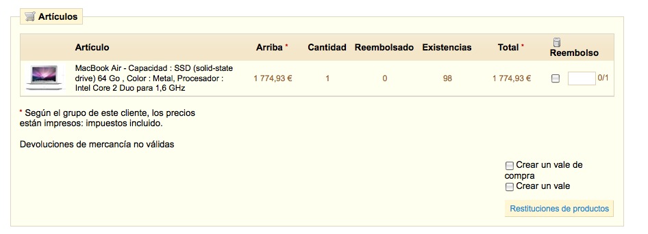 nadie Posted January 7, 2012 Share Posted January 7, 2012 Te adjunto las imagenes (2) lo q se ve cuando abro el pedido desde pedidos y la imagen(3) cuando abro el pedido desde detalle de mi cuenta en la tienda gracias Prueba hacer lo que te comente en el mensaje anterior: "Prueba restaurar el fichero PDF.php (bajarte prestashop, cojer ese fichero y copiarlo en clases/PDF.php... no sea que hayas tocado algun sin darte cuenta)" Link to comment Share on other sites More sharing options...