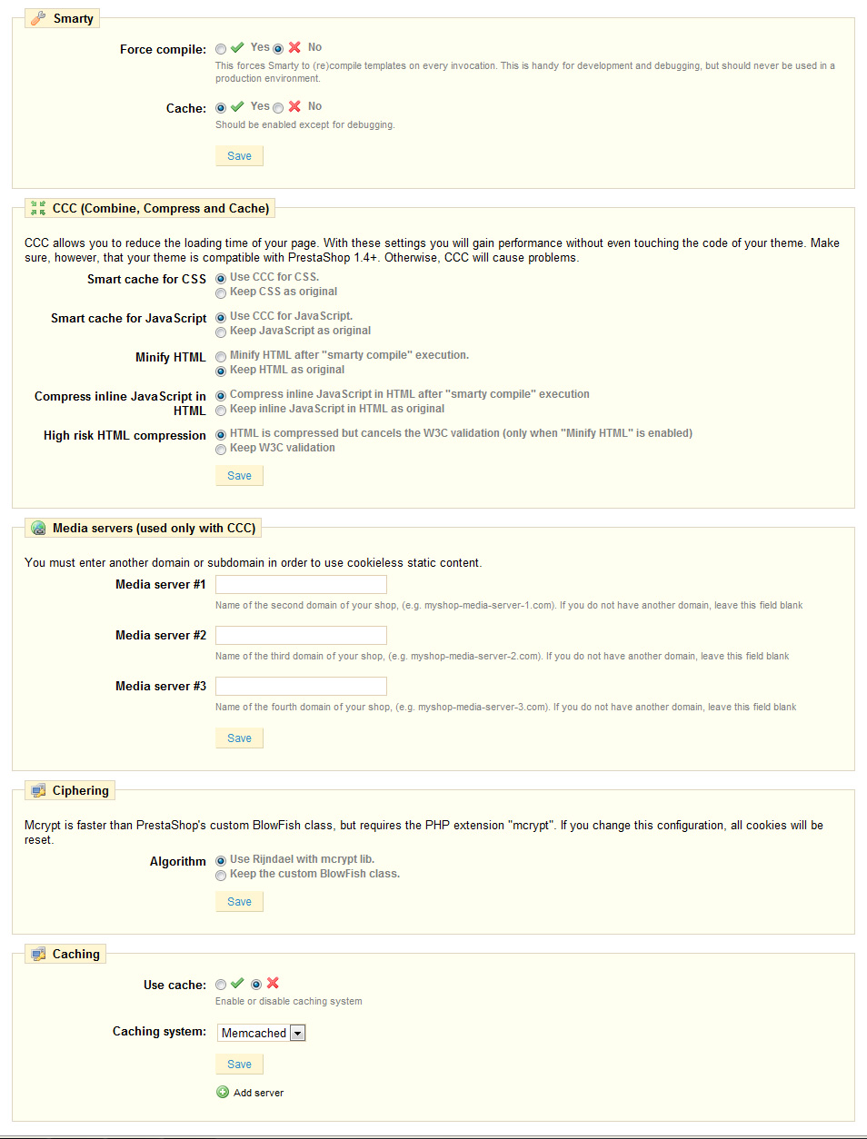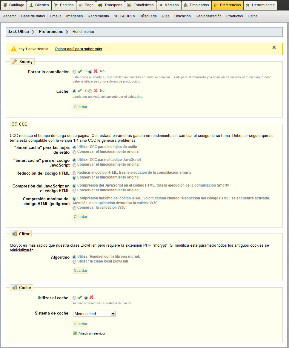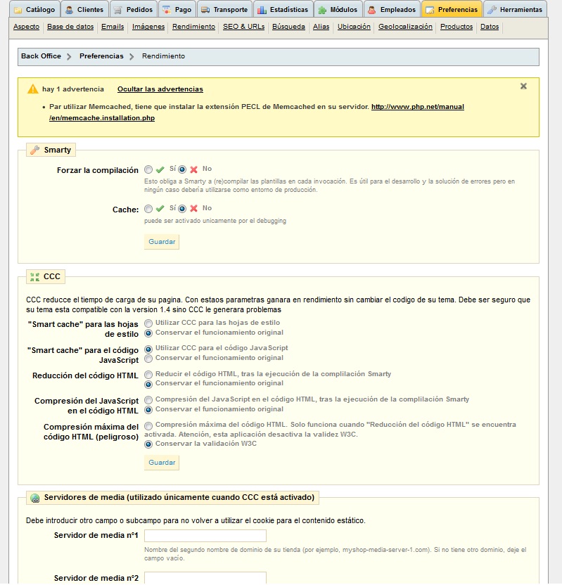 tepi Posted January 12, 2012 Author Share Posted January 12, 2012 aQs si miras las primeras fotos que adjunte veras como tengo todo configurado y cuando intento activar el cache del smarty... no se me queda marcado al grabarlo y me sale un aviso que me pone que....Para utilizar Memcached, tiene que instalar la extensión PECL de Memcached en su servidor. http://www.php.net/manual/en/memcache.installation.php Para volverse loco... Link to comment Share on other sites More sharing options...