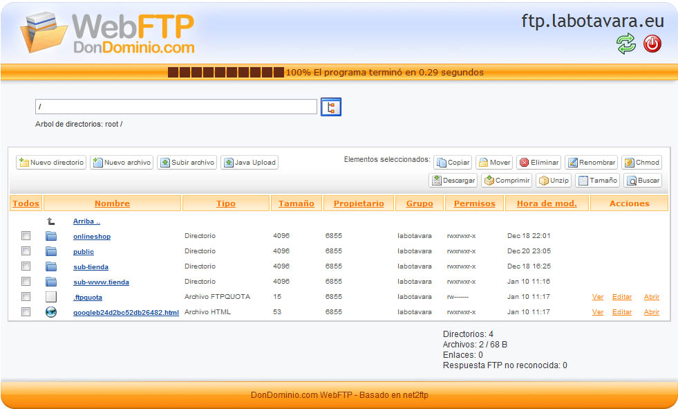 La Botavara Posted January 10, 2012 Author Share Posted January 10, 2012 Has subido ese fichero, mediante ftp al directorio principal de tu tienda, para poder acceder por ejemplo desde la url tutienda.xxx/google......html ? A ver, te cuento, porque tengo un lio.... Yo me hice la pagina web con don dominio, y como la tienda online que me ofrecian era muy mala, inserte una redireccion dentro de la pagina que me llevara a la tienda prestashop. Cuando me meto en la ftp, me sale lo de la foto. Mi duda es, antes de entrar en "sub-www.tienda", donde he copiado el archivo html, ¿eso es la pagina web de don dominio, o eso esta en otro sitio? Perdona por tantas molestias. Link to comment Share on other sites More sharing options...