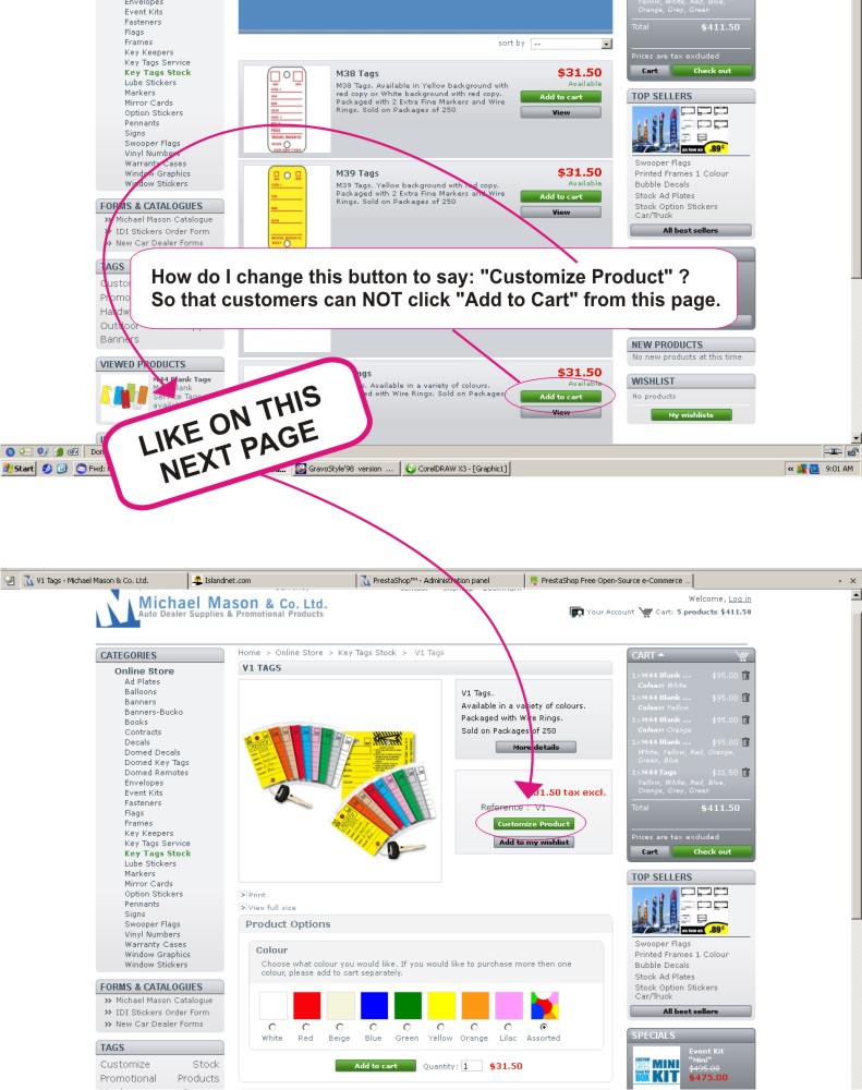 phrasespot Posted January 13, 2012 Share Posted January 13, 2012 I need to change the "Add to Cart" botton in my categories area to say "Customize Product" Back Office > Tools > Translations > Front Office translations > product-list - 10 expressions need to change this because a few people are ordering through the categories page and then they don't fill in the proper attributes for the products. You could hide the add-to-cart button completely. Back Office > Preferences > Products > Display "add to cart" button when product has attributes = no 1 Link to comment Share on other sites More sharing options...