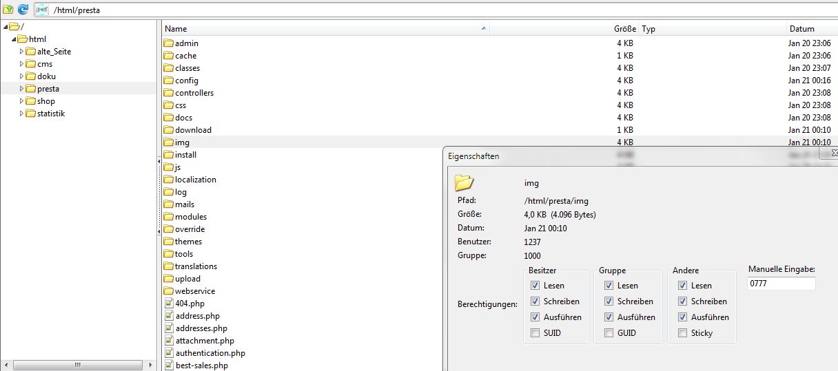 guest* Posted January 21, 2012 Share Posted January 21, 2012 Mehr als 0750 ist nicht nötig. Wie im Link beschrieben: Ordner UND Unterordner. Die Bilder selbst kannst du dann mit 0640 versehen, wenn sie mal oben sind. Sind auch die Unterordner des /img alle vorhanden ? Vergleiche mal den Ordner /img am FTP mit dem was du hochgeladen hast. Jede Prestashopversion ist da anders in der Struktur. Ich weiss leider nicht welche Version du verwendest. Die anderen Voraussetzungen an den Server wie: max_execution_time = 300 max_input_time = 300 memory_limit = 256M upload_max_filesize = 20M post_max_size = 20M allow_url_fopen = on - damit der Import von Bildern/Content aus externen Quellen funktioniert werden ebenso erfüllt ? Falls ja, dann bitte den Provider kontaktieren. Das Problem liegt am Server. Die Bilder werden mittels HTTP-Protokoll hochgeladen. Link to comment Share on other sites More sharing options...