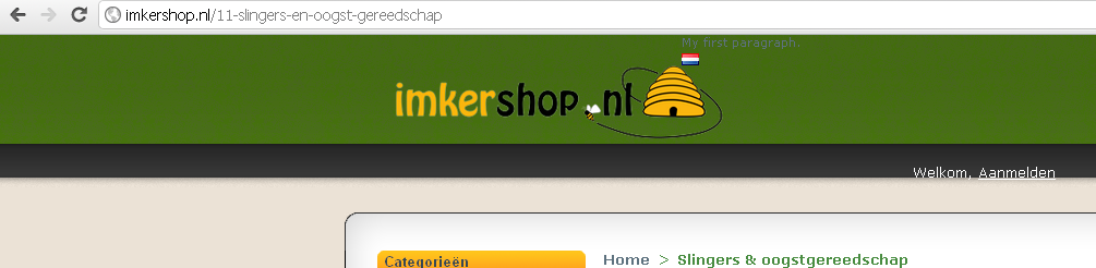 Smiles Posted January 16, 2012 Author Share Posted January 16, 2012 De force compile staat nu permanent aan.... ik heb de tools->smarty (en v2)-> cache en compile beide leeg gegooid en de cache zowiezo uitgezet... Ik denk dat hier iets fout moet gaan, meer weggooien de cache map in de root? een tekst in de hader gaat gewoon zie bijlage waar ik <p>My first paragraph.</p> heb toegevoegd. Ik heb gewoon het idee dat het een simpel foutje is ergens, maar waar... Vanavond kan ik weer dingen wijzigen vanmiddag ben ik onderweg. Dit is mijn header: {* * 2007-2011 PrestaShop * * NOTICE OF LICENSE * * This source file is subject to the Academic Free License (AFL 3.0) * that is bundled with this package in the file LICENSE.txt. * It is also available through the world-wide-web at this URL: * http://opensource.org/licenses/afl-3.0.php * If you did not receive a copy of the license and are unable to * obtain it through the world-wide-web, please send an email * to [email protected] so we can send you a copy immediately. * * DISCLAIMER * * Do not edit or add to this file if you wish to upgrade PrestaShop to newer * versions in the future. If you wish to customize PrestaShop for your * needs please refer to http://www.prestashop.com for more information. * * @author PrestaShop SA <[email protected]> * @copyright 2007-2011 PrestaShop SA * @version Release: $Revision: 6594 $ * @license http://opensource.org/licenses/afl-3.0.php Academic Free License (AFL 3.0) * International Registered Trademark & Property of PrestaShop SA *} <!DOCTYPE html PUBLIC "-//W3C//DTD XHTML 1.1//EN" "http://www.w3.org/TR/xhtml11/DTD/xhtml11.dtd"> <html xmlns="http://www.w3.org/1999/xhtml" xml:lang="{$lang_iso}"> <head> <title>{$meta_title|escape:'htmlall':'UTF-8'}</title> {if isset($meta_description) AND $meta_description} <meta name="description" content="{$meta_description|escape:html:'UTF-8'}" /> {/if} {if isset($meta_keywords) AND $meta_keywords} <meta name="keywords" content="{$meta_keywords|escape:html:'UTF-8'}" /> {/if} <meta http-equiv="Content-Type" content="application/xhtml+xml; charset=utf-8" /> <meta name="generator" content="PrestaShop" /> <meta name="robots" content="{if isset($nobots)}no{/if}index,follow" /> <link rel="icon" type="image/vnd.microsoft.icon" href="{$img_ps_dir}favicon.ico?{$img_update_time}" /> <link rel="shortcut icon" type="image/x-icon" href="{$img_ps_dir}favicon.ico?{$img_update_time}" /> <script type="text/javascript"> var baseDir = '{$content_dir}'; var static_token = '{$static_token}'; var token = '{$token}'; var priceDisplayPrecision = {$priceDisplayPrecision*$currency->decimals}; var priceDisplayMethod = {$priceDisplay}; var roundMode = {$roundMode}; </script> {if isset($css_files)} {foreach from=$css_files key=css_uri item=media} <link href="{$css_uri}" rel="stylesheet" type="text/css" media="{$media}" /> {/foreach} {/if} {if isset($js_files)} {foreach from=$js_files item=js_uri} <script type="text/javascript" src="{$js_uri}"></script> {/foreach} {/if} {$HOOK_HEADER} </head> <body {if $page_name}id="{$page_name|escape:'htmlall':'UTF-8'}"{/if}> {if !$content_only} {if isset($restricted_country_mode) && $restricted_country_mode} <div id="restricted-country"> <p>{l s='You cannot place a new order from your country.'} <span class="bold">{$geolocation_country}</span></p> </div> {/if} <div id="page"> <!-- Header --> <div id="header"> <a id="header_logo" href="{$base_dir}" title="{$shop_name|escape:'htmlall':'UTF-8'}"> <img class="logo" src="{$img_ps_dir}logo.png?{$img_update_time}" alt="{$shop_name|escape:'htmlall':'UTF-8'}" {if $logo_image_width}width="{$logo_image_width}"{/if} {if $logo_image_height}height="{$logo_image_height}" {/if} /> </a> <div id="header_right"> {$HOOK_TOP} </div> </div> <div id="pagetop"> </div> <div id="columns"> <div id="extra"> <!-- Left --> <div id="left_column" class="column"> {$HOOK_LEFT_COLUMN} </div> <!-- Center --> <div id="center_column"> {/if} Link to comment Share on other sites More sharing options...