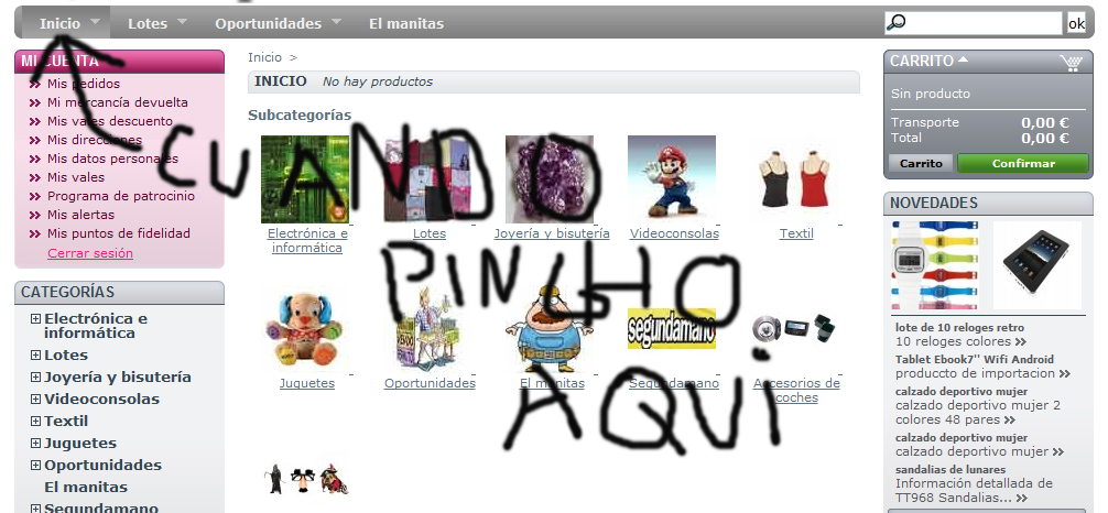 nadie Posted January 18, 2012 Share Posted January 18, 2012 ola cuando le doy a inicio me sale esto INICIO No hay productos ajunto imajen ¿Y quieres mostrar otra cosa??, O solo un enlace a la home... como comenta 4 webs?? Saludos Link to comment Share on other sites More sharing options...