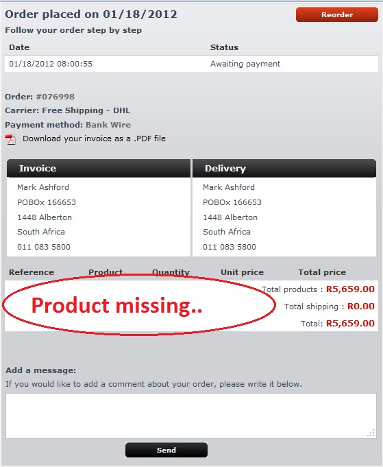 stopshop Posted January 18, 2012 Share Posted January 18, 2012 We recently upgraded from PS 1.0.0.4 to 1.4.6.2, the problem I'm sitting with is that ordered products do not show in the order history (Front Office -> My orders). When my customers lo into their account and click on "My orders" then select any of their existing orders, these open and show the correct order amount/value but without any products being displayed in the actual order (see attached image). In the BO everything seems ok, I can view the orders as well as the products ordered in each order. My customers also receive the order confirmation emails which display the product/s ordered so no problem here, the only issue seems to be in the front office when accessing "My orders". Besides the inconvenience, this causes another problem. A customer is unable to request a return should a product be faulty because there's no product to select within the order. We've done the following to eliminate possible causes; * Switched on the default theme.., problem persists * Force Compile on, refreshed, Force Compile off, placed new order.., problem persists Any suggestions are greatly appreciated, thanks. [uPDATE]: If from the front end I open "My merchandise returns", then I am able to view passed return requests (RMA's) and these display the products correctly. This referring to returns processed while still using PS version 1.0.0.4 and not after the upgrade to 1.4.6.2. Link to comment Share on other sites More sharing options...