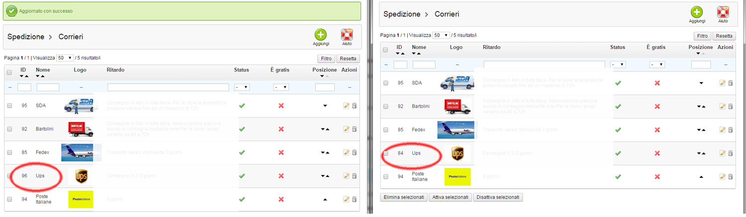 Ciao Cyber, interessante la tua soluzione PHP ma c'è un grosso però! Come sai fissare a codice un valore ( 21 per identificare il corriere) non è mai buona cosa sopratutto per gli ID corrieri di Prestashop. Infatti basta che da backoffice aggiorni tale corriere e il suo ID cambia ( ad esempio da 21 passerà a 23 qualora il 23 non sia già di un altro corrirere). Se è tuo il negozio allora tornerai nel codice e cambierai tale ID ogni volta che da backoffice aggiornerai tale corriere, ma se il negozio è di un cliente non ti puoi aspettare che questo lo faccia. Cosa ne dici?