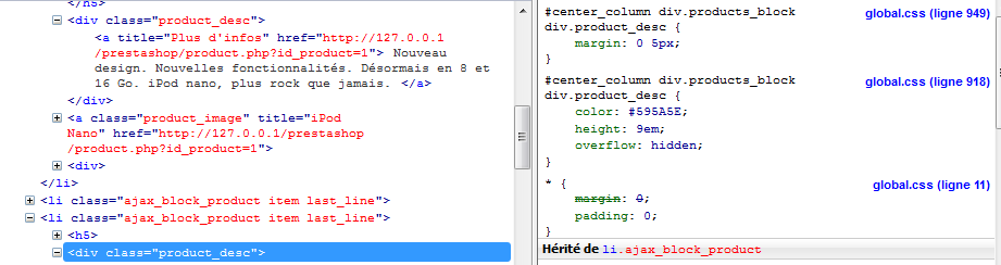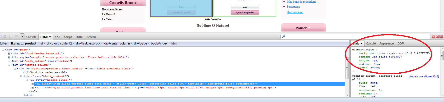 Lixi Posted January 18, 2012 Share Posted January 18, 2012 Bonjour, je voudrais changer via CSS le style de mes produits phares en page d'accueil de mon site. Pour êter plus précis, chaque produit est entouré par un cadre dont je voudrais changer la couleur et l'épaisseur. Via Firebug, j'obtiens : element.style { ... border: 2px solid #009900; margin: 2px; ... } Cependant il ne m'indique pas dans quel fichier css modifier ces paramètres, j'en ai donc déduits qu'ils étaient en dur dans le code. J'ai essayé de rajouter dans Globals.css : .block_content2 ul li { border: 1px solid #000000; } cependant c'est écrasé par les paramètres vu plus haut. Est il possible de modifier "en dur" ces propriètés directement dans le fichier concerné? Et si oui quel est le nom du fichier qui gère les produits en page d'accueil car je ne le trouve pas ! Merci d'avance ! Lixi Link to comment Share on other sites More sharing options...