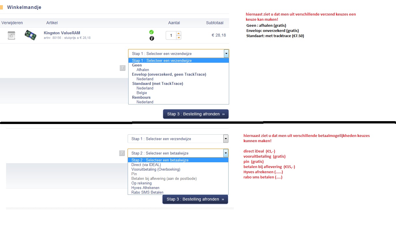 aliasali Posted January 18, 2012 Share Posted January 18, 2012 Geachte heren, Ik wil graag in mijn webshop mijn klanten de keuze geven om via bankoverschrijven (gratis) of iDeal (€1,-) te betalen. Echter als men er voor kiest om met iDeal te betalen dan zou ik graag extra kosten in rekening willen brengen €1,-. En wil graag men ook verschillende keuzes kunnen geven hij het verzenden van de producten. Zie Attached thumbnails!!! Ben al een tijd aan het zoeken geweest naar z'n module maar ik heb zelf niks kunnen vinden, misschien heeft iemand hier meer koek van gegeten! Graag hoor ik van jullie groeten aliasali Link to comment Share on other sites More sharing options...