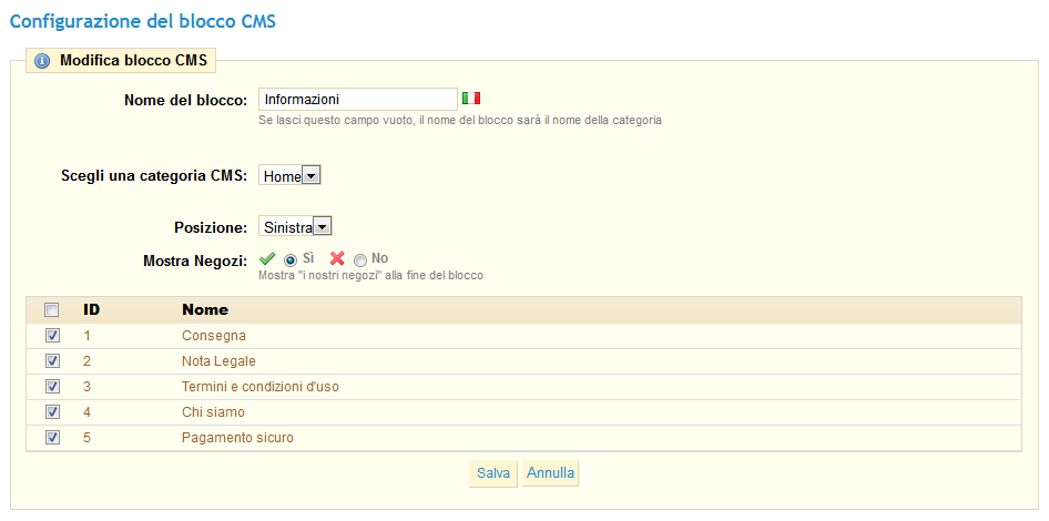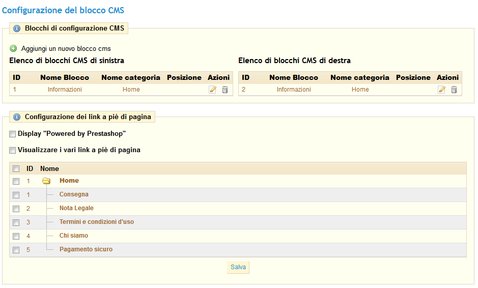 eugenata Posted January 22, 2012 Share Posted January 22, 2012 Non riesco a visualizzare il blocco CMS: Le pagine sono quelle di default, nella scheda Strumenti > CMS Il modulo cms è configurato come da figure allegate Il risultaro lo vedetre in allegato PERCHE'? (PrestaShop™ 1.4.6.2) Link to comment Share on other sites More sharing options...