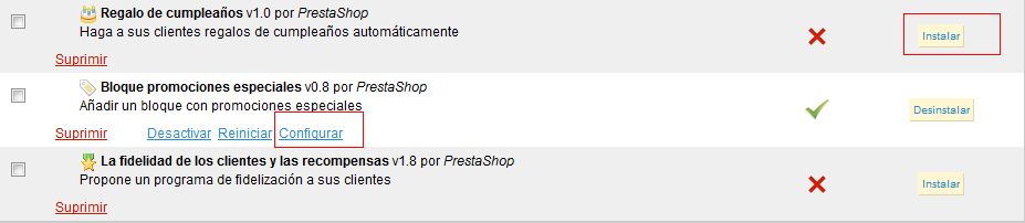 banense Posted January 24, 2012 Share Posted January 24, 2012 Si , cuando lo subes debes instalarlo. A tu derecha dice instalar haces clic ahí y listo luego si tiene configuración le pones la conf que más te guste y listo.. te adjunto una imagen de un sitio de prueba para que veas.. Si no está instalado te aparecerá como el primer recuadro de la derecha y luego si tiene configuración adicional como el de abajo.. El mensaje que te escribí anteriormente era por si no encontrabas el módulo pues a veces me sucede que lo cargo y luego no me acuerdo del nombre y por eso hago eso que te comenté. Saludos Link to comment Share on other sites More sharing options...