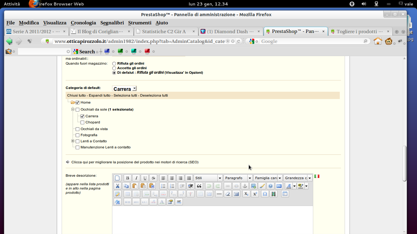 pirox Posted January 24, 2012 Share Posted January 24, 2012 Salve a tutti! Ho problema che non riesco a risolvere: sul mio store www.otticapirozzolo.it ho creato delle categorie p.e. Occhiali da sole e in qeust'ultima delle sottocategorie nelle quali ho inserito i prodotti, ora se clicco sulla categoria principale mi appare la lista dei prodotti e vorrei non fosse così.Qualche aiuto? grazie in anticipo Link to comment Share on other sites More sharing options...