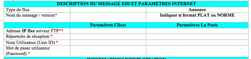 J'ai reçu un fichier à remplir et dedans on me demande le préciser pour la Description du message EDI et parametres internet, le type de flux et la version en me demandant de choisir entre PLAT et NORME. Voir le fichier attaché pour mieux comprendre.