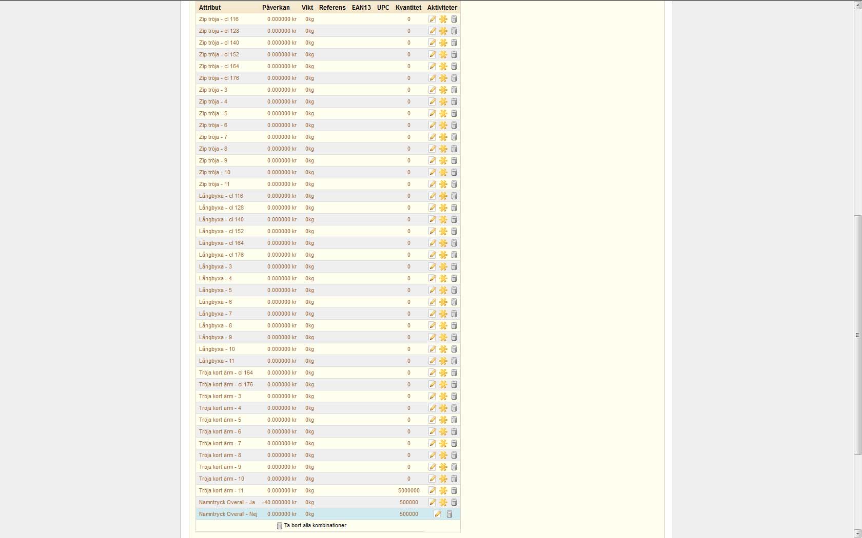 ruilong Posted January 31, 2012 Share Posted January 31, 2012 Du har skapat kombinationerna fel, vad jag kan se har du 4 olika grupper (zip tröja, långbyxa, tröja kort ärm och namntryck overall) vad du behöver göra är att skapa kombinationer för samtliga val, dvs ziptröja 10, långbyxa cl 116, tröja kort ärm 3, namntryck overall ja = 1 kombination, osv för alla tänkbara val kunden kan tänkas vilja ha. Det finns en länk högst upp på sidan för kombinations generatorn som du kan använda och där snabbskapa alla möjliga kombinationer av de val som finns. 1 Link to comment Share on other sites More sharing options...