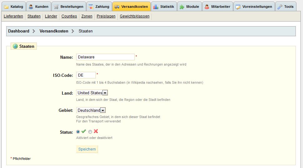 LENNOXX Posted February 1, 2012 Author Share Posted February 1, 2012 ...was heisst "zone falsch angelegt"??? ich habe alle durchgesehen und keine für deutschland gefunden. allerdings war "Delaware" mit "DE" von vornherein angelegt (siehe datei). habe dann "Deutschland" mit ebenfalls "DE" angelegt (siehe andere datei). war das falsch? was soll ich denn da ausser "DE" reinschreiben???????? und weswegen kann ich bei "Land" nicht auswählen was auch für deutschland passen würde??? soll ich "Delaware" löschen bzw. ändern, weil 2x DE nicht funktioniert??? oder soll ich alle anderen Staaten löschen, dass nur noch Deutschland übrig bleibt? Link to comment Share on other sites More sharing options...