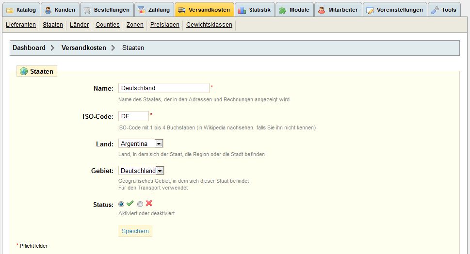 guest* Posted February 2, 2012 Share Posted February 2, 2012 Du hast geschrieben "Deutschland" anstatt "DE"(Iso-Schlüssel) Das ist falsch. Außerdem bist du ganz falsch. Ich habe nicht geschrieben Versandkosten -> Staaten, sondern Versandkosten -> Zone. Bei Versandkosten -> Zone -> Neu, sind nur die Felder: Name und Status vorhanden. Keine anderen Felder. Du musst dort als Name DE, IT, AT oder sonstwas eintragen (also den Iso-Schlüssel) und dann aktivieren. Das war es. Das was du eingerichtet hast sind die Staaten für USA. Dort musst du überhaupt nichts anlegen oder ändern, wenn du nicht in/von USA den Shop betreibst. Link to comment Share on other sites More sharing options...