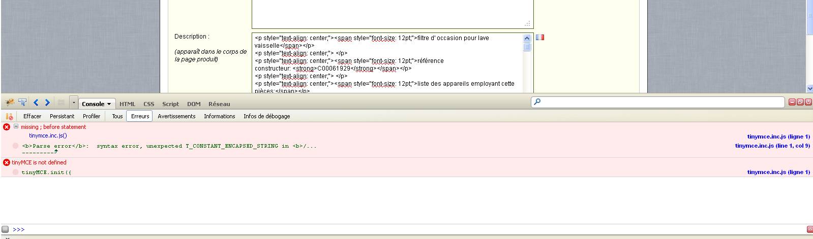marc-electro Posted February 4, 2012 Share Posted February 4, 2012 bonjour, suite a une nouvelle mise a jour (encore) 1.4.0.17 a 1.4.6.2 je n'est toujours pas l'éditeur de texte tinymce j'ai je penses tous essayer (vider le cache plusieurs fois ,actualiser a plusieurs reprise, vider les fichier temporaire tool cache et compile, recharger le dossier js tinymce , désinstallation le module éditoriale puis réinstaller, essayer sur plusieurs navigateur et toujours rien des que je repasse sur mon ancienne version 1.4.0.17 ca refonctionne bien l'éditeur est bien la voici quelque capture d'écrans avec firefox qui me dit une erreur mais je ne vois pas d'ou cela peut venir merci pour votre aide car la je galère Link to comment Share on other sites More sharing options...