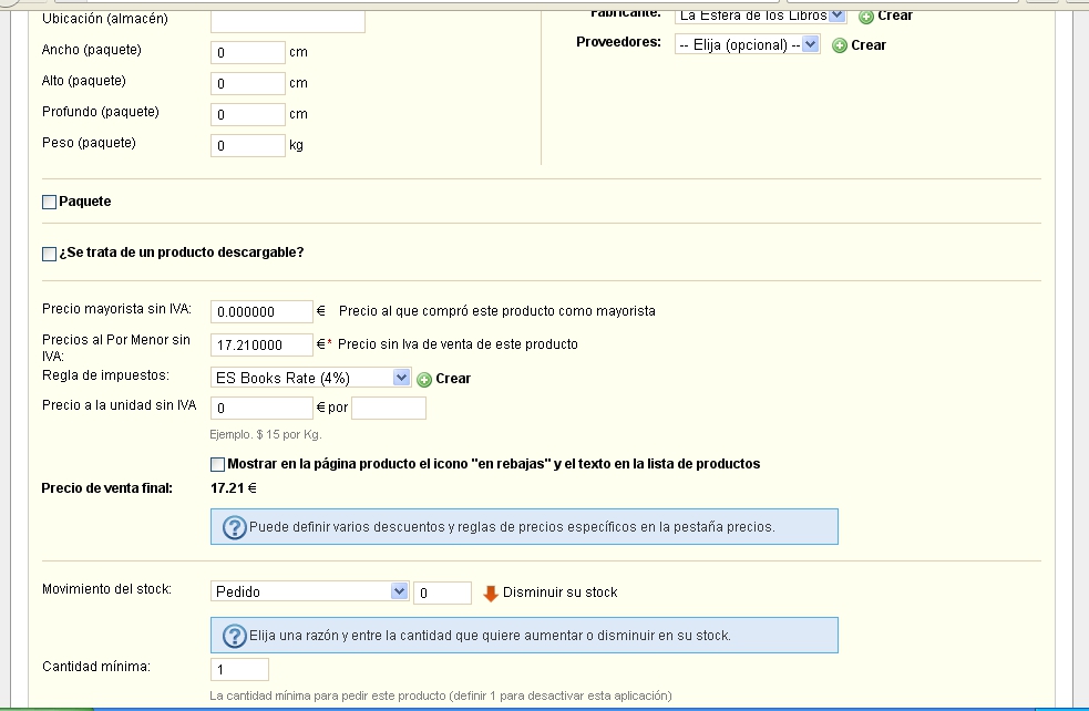 Beba Posted February 5, 2012 Share Posted February 5, 2012 Before using version 1.3.7 and various technical issues, rather than upgrading what I have done is to install a new paragraph 1.4.6.2 version, installing well and without problem, but I started to create items and not PVP is a field with the VAT and the price included to give the article, are the fields: - Wholesale Price without VAT: - Retail Price without VAT: I found a post where he says that to calculate the price without VAT of the article from the VAT price, divide the price with VAT from 1.04, it is no problem. But ... Does anyone know why not leave the field of VAT already included PVP? Because my items are books, and the price of books is set by law (at least here in Spain) and as the mess with prices can have a serious problem. Do you leave the field to you? Thanks for your help! (I include the screenshot of the tab to create products by if I'm setting wrong or different from yours). P.D: sorry for my english Link to comment Share on other sites More sharing options...