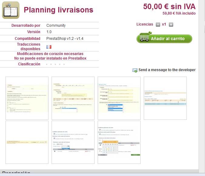 nadie Posted February 7, 2012 Share Posted February 7, 2012 Modulo Planning livraisons o modulo de feche y hora de entrega. Hola quiero exponer el problema que tengo actualmente este modulo. Buscando un modulo que le permitiera al cliente escoger la fecha y hora de entrega de su pedido me encontré en este mismo foro un enlace a este modulo http://addons.presta...livraisons.html que cumplía con mis necesidades para mi tienda prestashop versión 1.4.6.2, y efectivamente lo compre pero la sorpresa viene cuando al clicar en el enlace me aparecieron estas especificación “compatible con la versión 1.4” como se ve en la imagen que adjunto hecha el día de la compra. Pero actualmente al clicar en el enlace aparece que ya no es compatible con la versión 1.4, me he puesto en contacto con el servicio técnico de prestashop pero no tienen soporte en español por lo q he tenido que traducir todos los mensajes y se tarden demasiado tiempo en contestar y no me dan una solución pronta al problema. Dicen que cuando esté disponible la versión 1.4 me avisaran, pero no explican por que cuando yo lo compre aparecía que era compatible con la versión 1.4. Que puedo hacer para solucionar el problema he enviado 4 correos y no me solucionan nada y lo q es peor no hay otro modulo que haga lo mismo. Estaba pensando en devolver el pago de paypal, porque creo que la culpa no es mía de una mala información en el momento de la compra. Espero que alguien me pueda ayudar con este problema o saber si yo puedo actualizar el modulo a algo así, gracias por leer este pos. En la url de compra dice que es compatible solo con la 1.2. y la 1.3... Link to comment Share on other sites More sharing options...