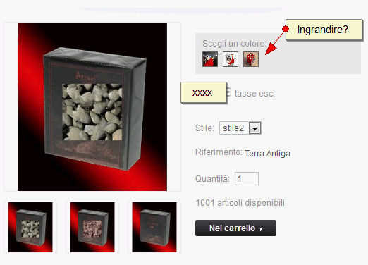 eugenata Posted October 16, 2012 Author Share Posted October 16, 2012 Ciao zeroscorte, le dimensioni delle immagini sono indicate nel file product.tpl del tuo tema, dovrebbe esserci un blocco di codice identificato da questo commento: <!-- colors --> all'interno trovi il tag <a> che contiende i valori : width="20" height="20". Modificali a piacimento e aggiusta anche la classe del foglio di stile (product.css) richiamata dal tag <a> che potrebbe avere dei valori impostati per width e height. Ovviamente, come ho scritto sopra, Ps non rididimensiona le immagini caricate, quindi regolati. Poi, visto che sei un designer, ti consiglio la lettura di questo documento: http://doc.prestasho.../Designer+Guide indispensabile per quelli "come noi" Link to comment Share on other sites More sharing options...