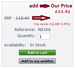 lornalove Posted February 13, 2012 Share Posted February 13, 2012 Wondered if someone could advise me on how to add the text "Our Price" just above my product price and also ive added the rrp module to my site and would like to move the price to the right insted of where it appears on the left. Have taken a pic's to show you. This is how it looks now This is how i would like it to look Thanks for your time Dawny xx Link to comment Share on other sites More sharing options...