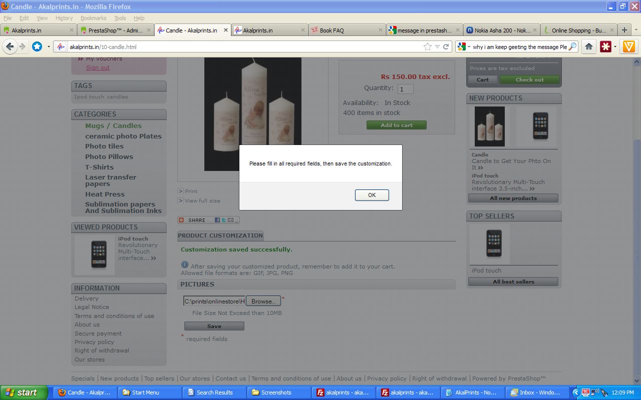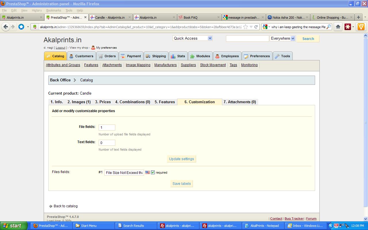Akallprints Posted February 16, 2012 Share Posted February 16, 2012 Hi, i had install prestashop, i want to give permission to customer so that he/she can upload a image so that we can imprint on tshirt. i did add value=1 in customization tab and check Requires Fiels so that customer had to upload image before Check out ..But i am getting a error After making it field=1 & REQUIRED. Testing on webstore i did upload a file but still i am getting a error ."Please fill in all required fields, then save the customization" So help Please... Link to comment Share on other sites More sharing options...