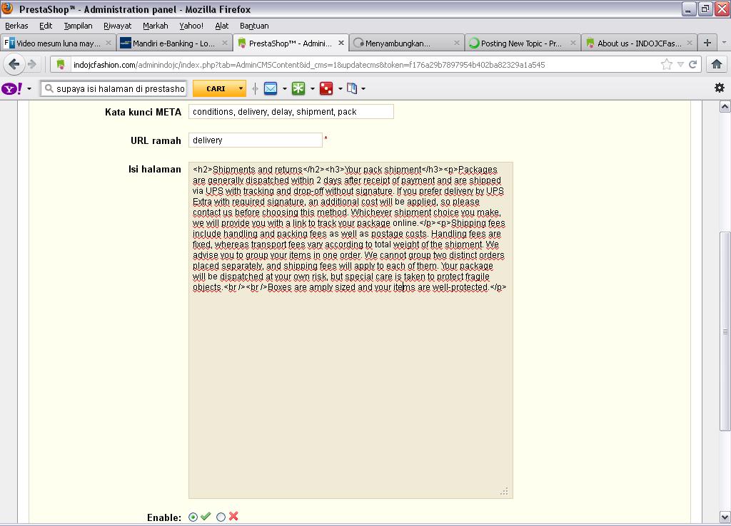 budiharu Posted February 17, 2012 Share Posted February 17, 2012 aku pengen ubah2 artikel n uplod gambar di halaman artikel gimana ya biar ga munculna code2 gini Shipments and returns Your pack shipment Packages are generally dispatched within 2 days after receipt of payment and are shipped via UPS with tracking and drop-off without signature. If you prefer delivery by UPS Extra with required signature, an additional cost will be applied, so please contact us before choosing this method. Whichever shipment choice you make, we will provide you with a link to track your package online. Shipping fees include handling and packing fees as well as postage costs. Handling fees are fixed, whereas transport fees vary according to total weight of the shipment. We advise you to group your items in one order. We cannot group two distinct orders placed separately, and shipping fees will apply to each of them. Your package will be dispatched at your own risk, but special care is taken to protect fragile objects. Boxes are amply sized and your items are well-protected.kalau di local koq udah otomatis bisa berubah sendiri thx ya . apakah aku harus pasang modul or plugin something gt Link to comment Share on other sites More sharing options...