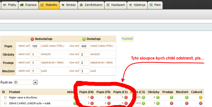 Mlsounkov Posted February 19, 2012 Share Posted February 19, 2012 Hi všem! Prosím o nedůležitou radu, ale mě "točící" funkci... ;-) Ve statistikách -> katalogové soupisky se mi zobrazuje i popis v jiných jazycích (konkrétně EN, FR, ES), což zkresluje celkové hodnocení. Proto se pídím po radě, jak tyto sloupce ze soupisky odstranit, anichž bych musel mazat jazyky jako celek. Pokoušel jsem se to dohledat v ../modules/statscheckup/statscheckup.php, ale nějak nevím, co vlastně chci v PHP odstranit... Určitě to bude "prkotina" a pro vás zkušené "brnkačka". Kuju! :-) Pro jistotu ještě nahazuju obrázek, pro lepší pochopení mého slovosledu. ;-) Předem díky za ochotu. Link to comment Share on other sites More sharing options...